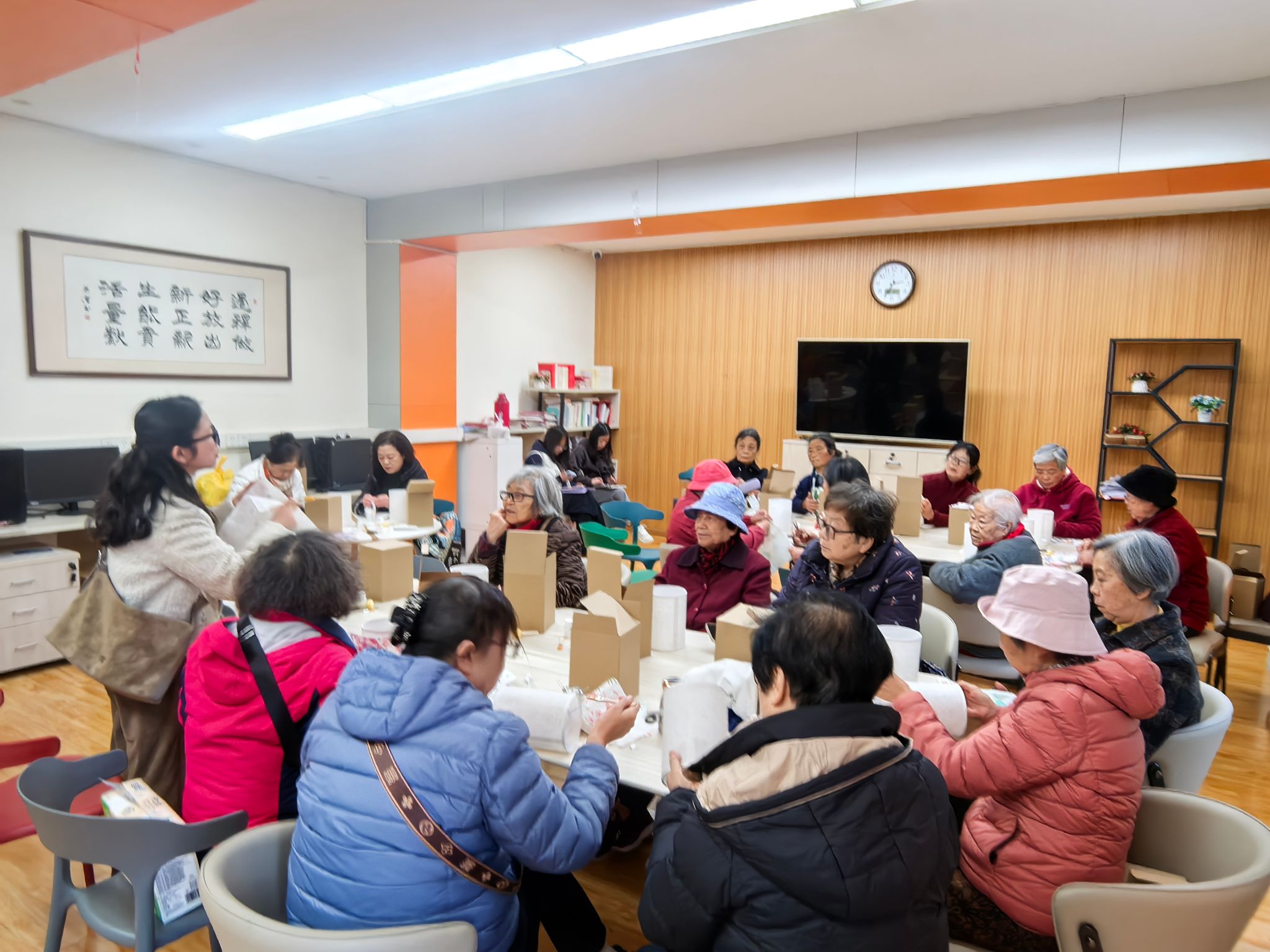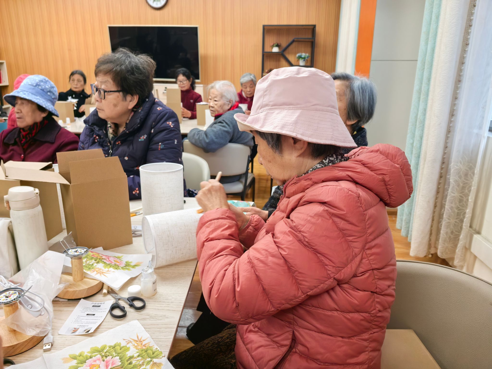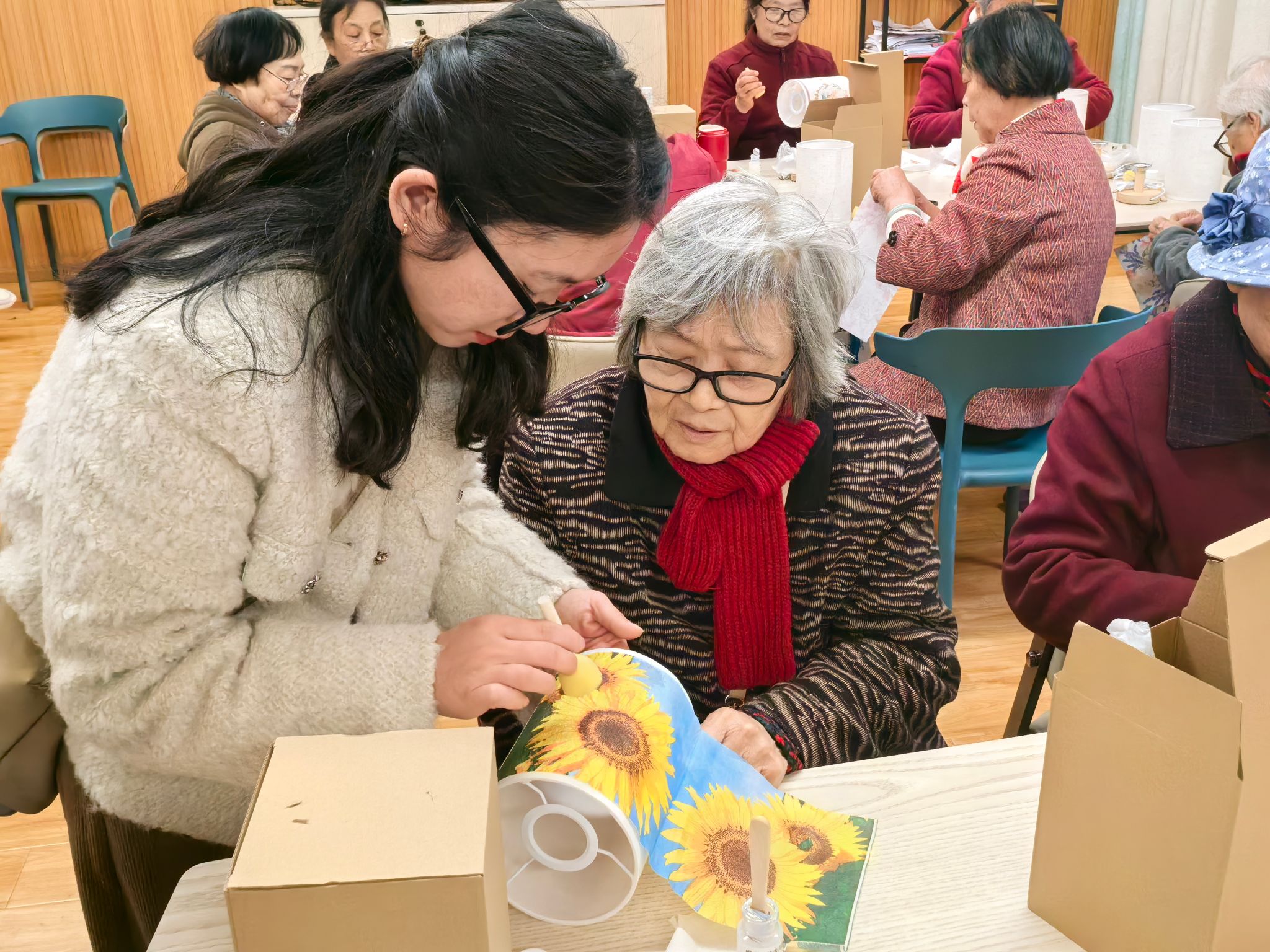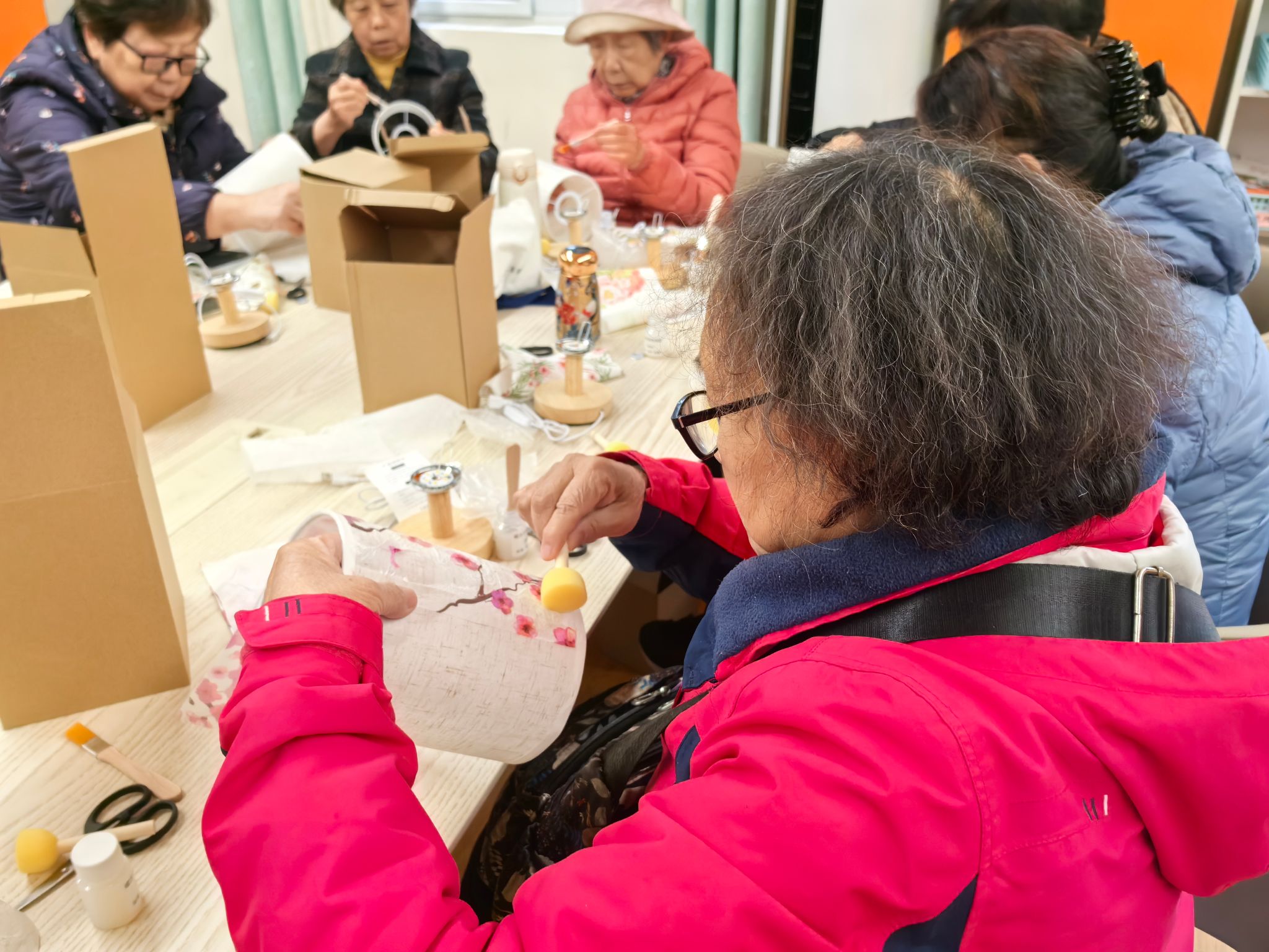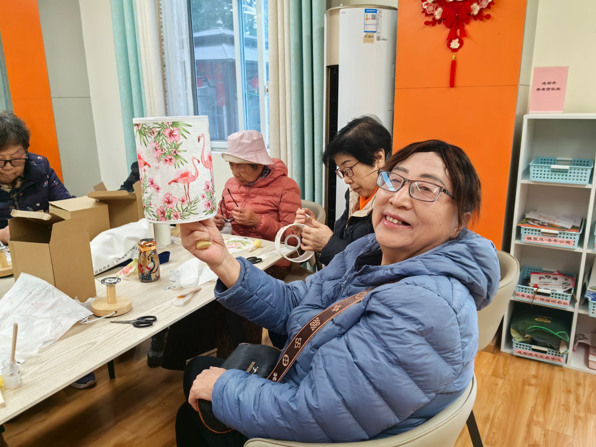 活动现场,手工制作区人气高涨。DIY小台灯环节中,老同志们手持材料包,认真聆听春台悦管家老师的指导,裁剪、拼接、组装有条不紊,一个个造型别致的小台灯在指尖逐渐成型,灯光亮起的瞬间,脸上洋溢着成就感;自制艾草锤环节,大家揉捻艾草、包裹布料、固定绳结,亲手制作的艾草锤散发着天然清香,寄托着对健康的期许。老同志们相互交流技巧、分享心得,现场氛围热闹而融洽。