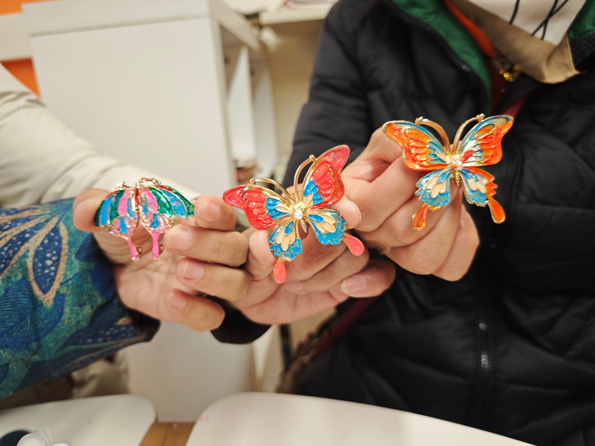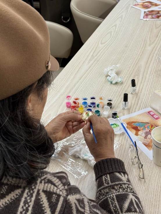 活动现场暖意融融,各色颜料、纤细画笔与金属胸花底座摆放整齐。老同志们刚听完工艺介绍,便迫不及待地投入创作。大家或低头细描,或互相请教调色技巧,时不时分享制作心得。创作间隙,有人展示自己色彩鲜亮的报喜鸟胸花,有人分享蓝得像天空的蝴蝶作品,现场笑声不断。就连不小心打翻颜料罐的小插曲,也被大家打趣成 “给胸花添了片云”,平添不少乐趣。