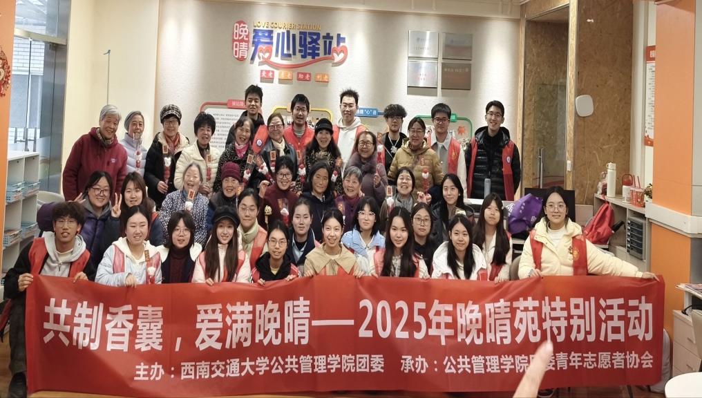 为弘扬中华民族“尊老、敬老、爱老、助老”的传统美德,丰富离退休老同志精神文化生活。2025年12月18日下午,公共管理学院青年志愿者协会晚晴爱心服务队在九里校区晚晴爱心驿站组织开展“共制香囊,爱满晚晴”敬老月活动。