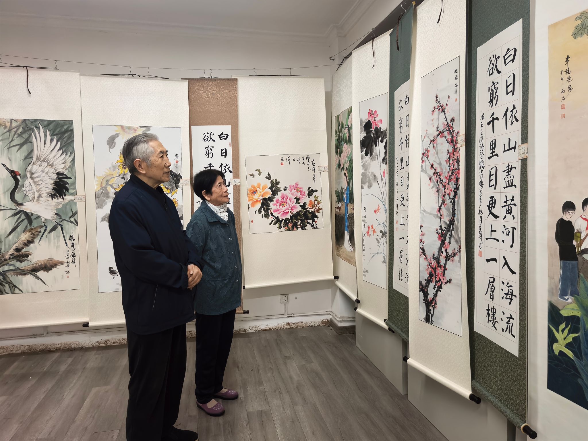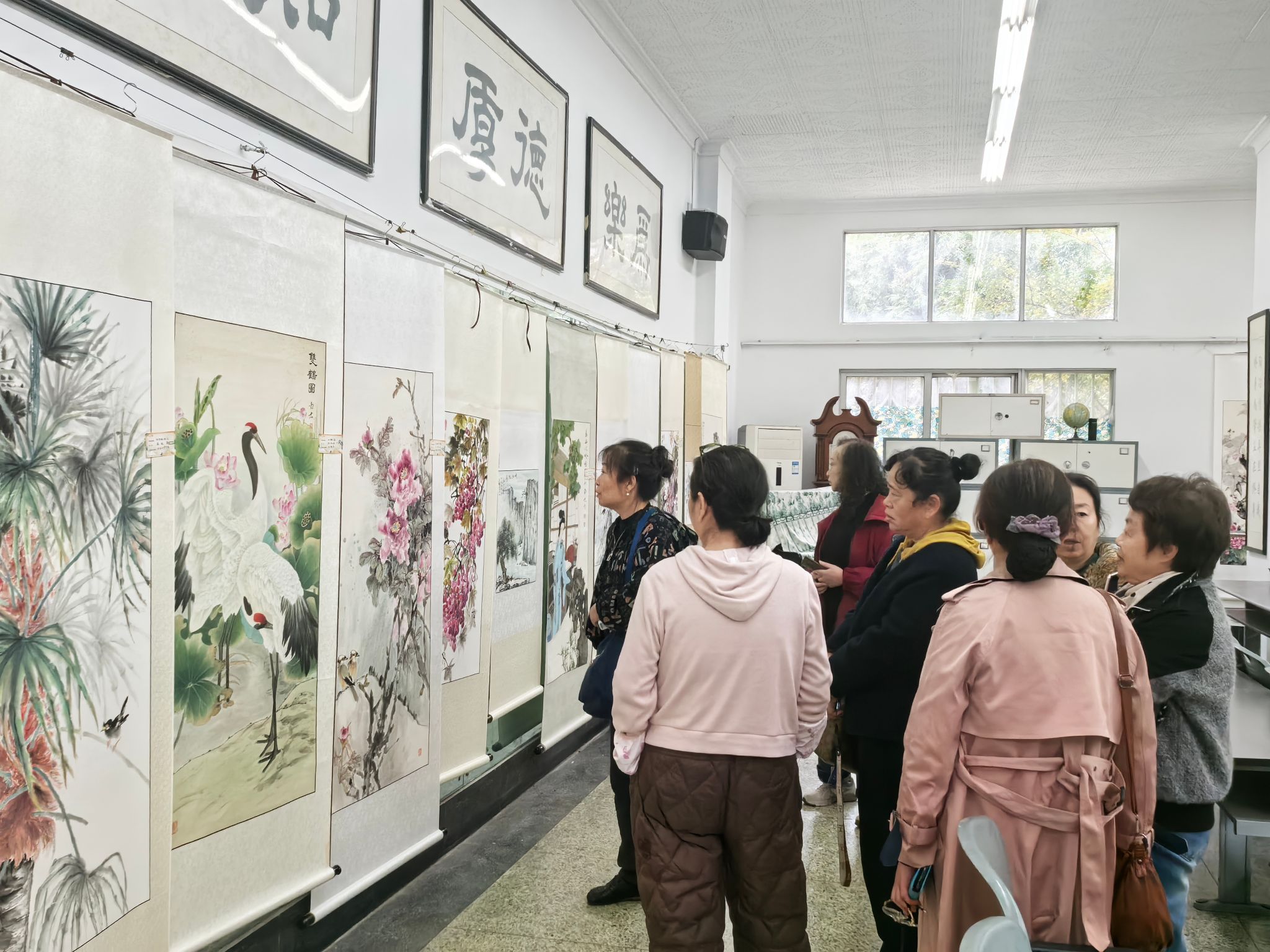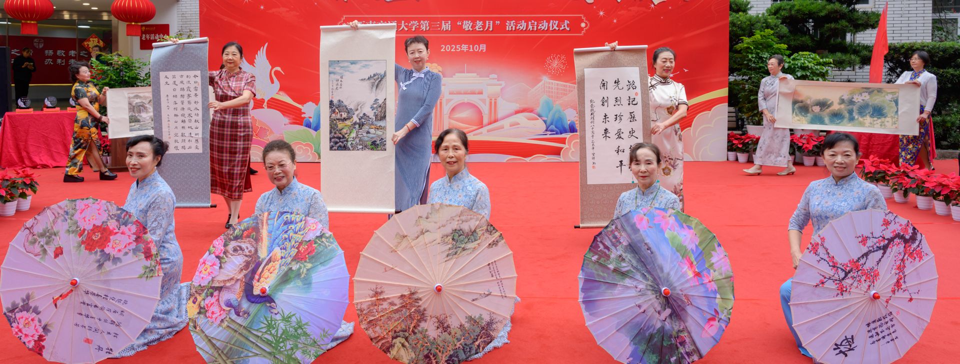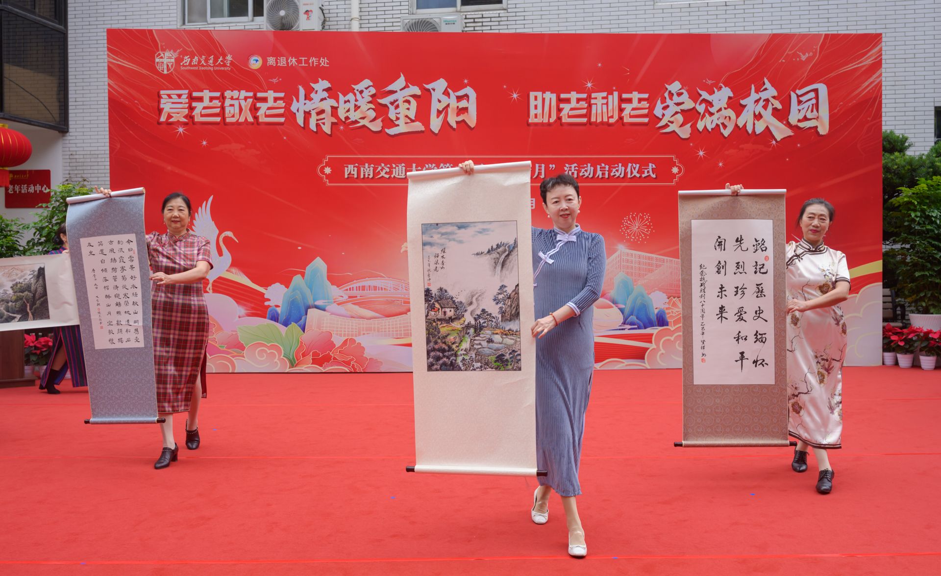 活动现场,老年大学学员带来舞蹈《如愿》和书画主题走秀《墨笔生花》,晚晴合唱团带来《在希望的田野上》《爱我中华》歌曲联唱,现场还举办“翰墨颂华章 重阳敬芳华”离退休教职工书画展,吸引众多师生驻足欣赏。
