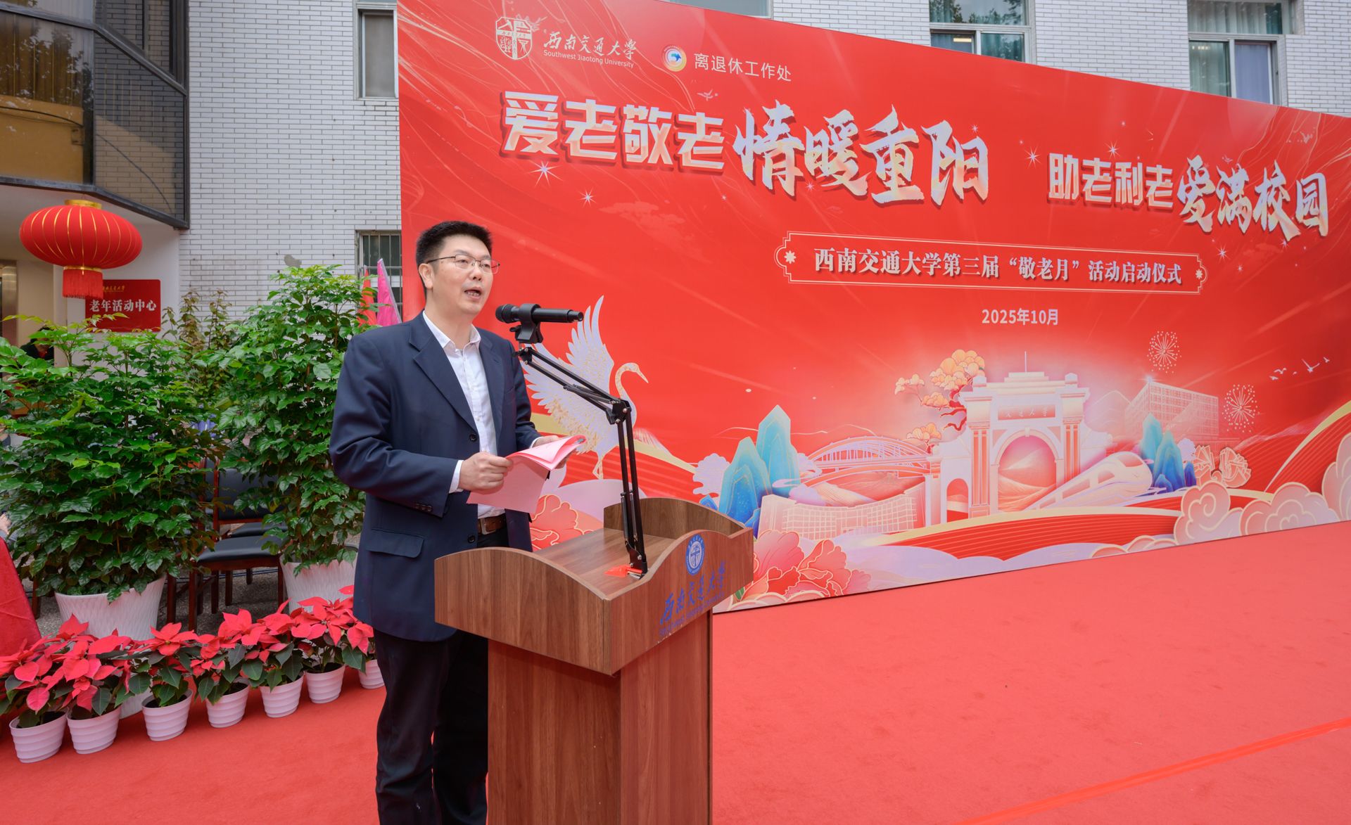 10月30日,西南交通大学第三届“敬老月”活动启动仪式在九里校区老年活动中心举行。校长闫学东,党委副书记杨爱华,学校关心下一代工作委员会副主任刘学信出席活动。离退休工作处处长杨德友主持启动仪式。