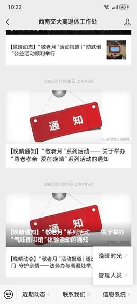 第二步:打开“西南交大离退休工作处”公众号页面,点击页面右下角“信息系统”,弹出菜单,点击“晚晴时光”,经过认证后的手机会自动进入系统页面。