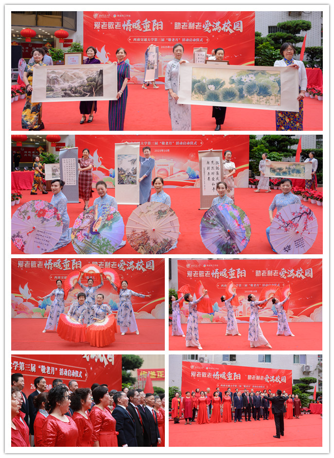 活动现场,老年大学学员带来舞蹈《如愿》和书画主题走秀《墨笔生花》,晚晴合唱团带来《在希望的田野上》《爱我中华》歌曲联唱,现场还举办“翰墨颂华章 重阳敬芳华”离退休教职工书画展,吸引众多师生驻足欣赏。