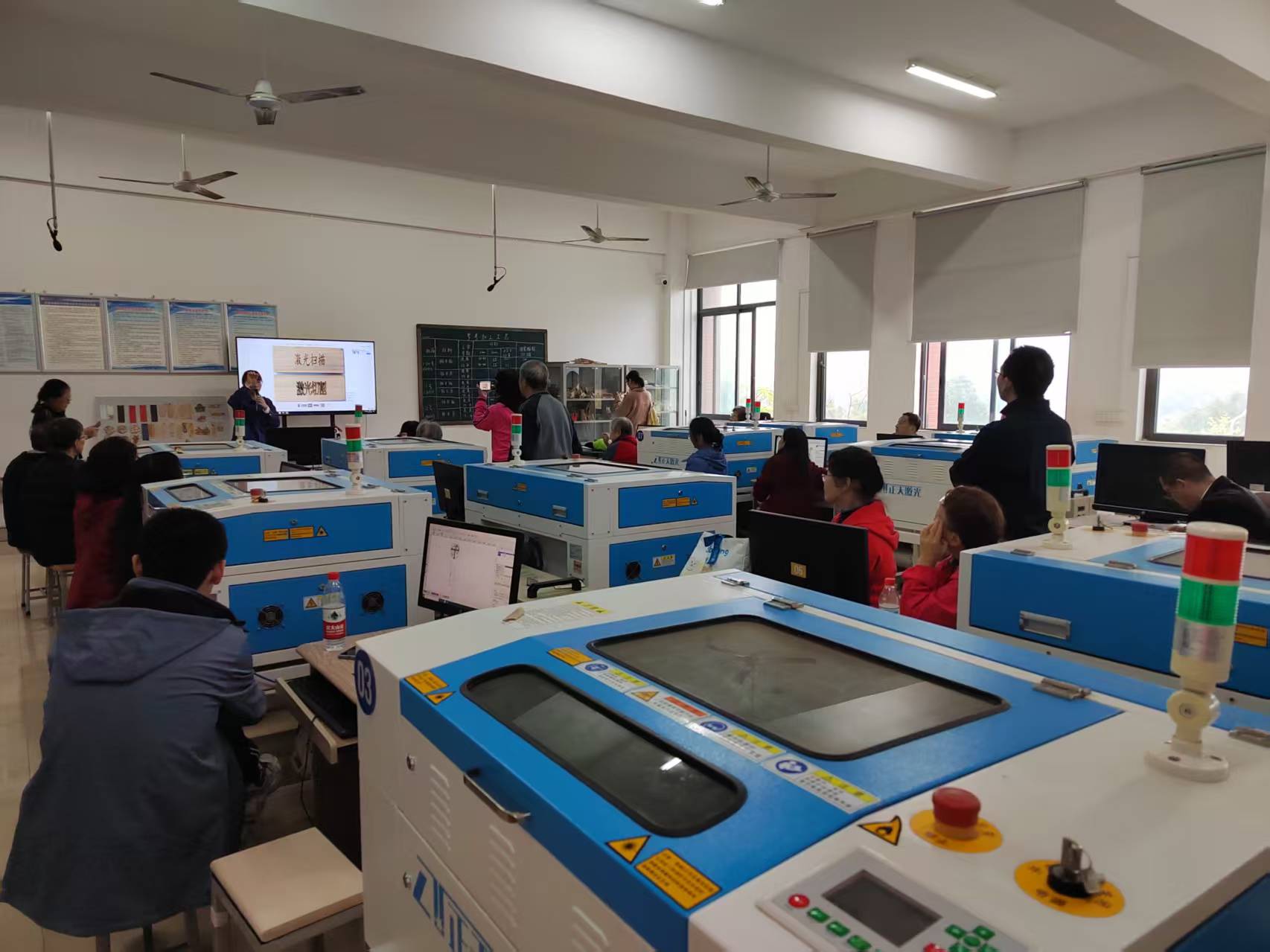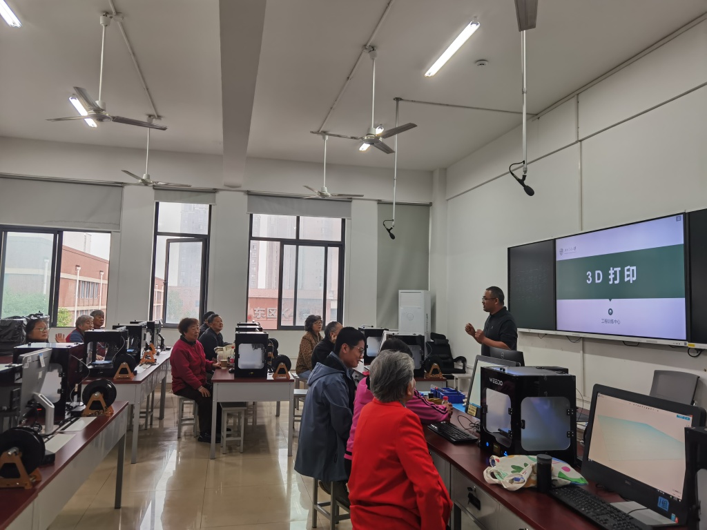 本次活动内容包括3D打印、激光切割等现代工程技术体验。在3D打印体验区,退休教职工现场选择喜欢的图案(如“寿桃”“菊花”“福字”等),由志愿者协助操作3D打印机,制作个性化钥匙扣或摆件。在激光切割体验区,退休教职工选择传统纹样(如“云纹”“蝙蝠”),在志愿者指导下操作激光切割机,制作木质或亚克力材质的灯罩。